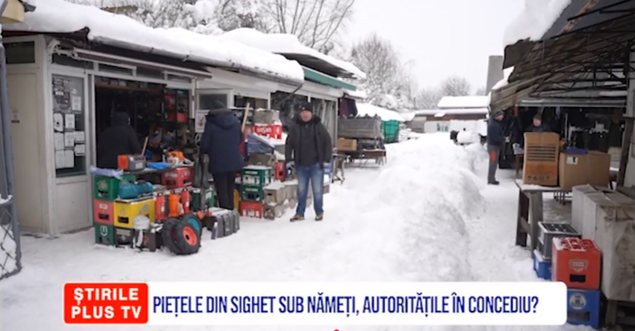 În Sighetu Marmației, vânzătorii din piețe se luptă cu zăpada mai mult decât cu clienții.